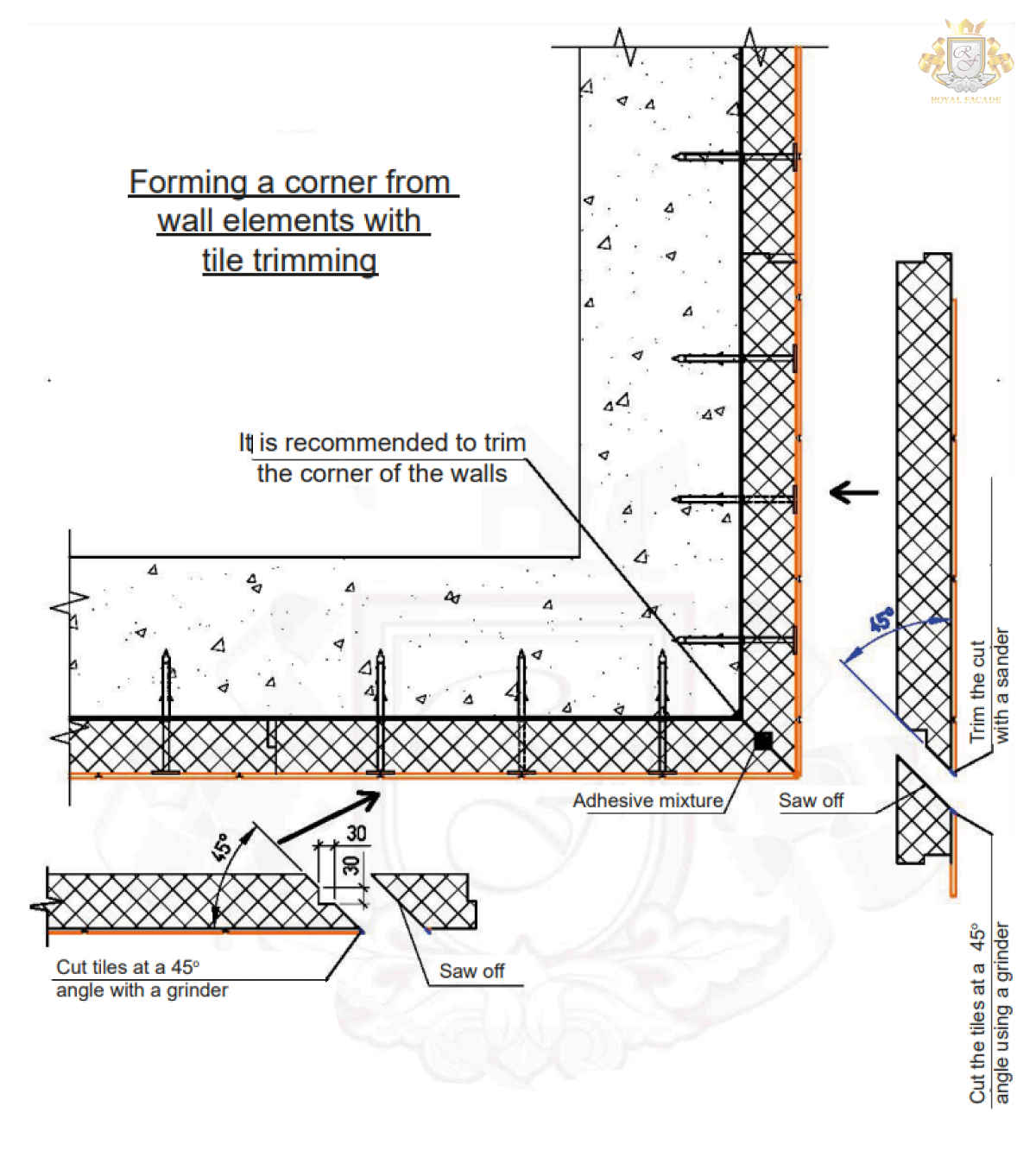 The corner element from Royal Facade is a monolithic sturdy structure consisting of a layer of polystyrene foam (expanded or extruded) with pressed tiles featuring different cutting angles (90° or 45°).